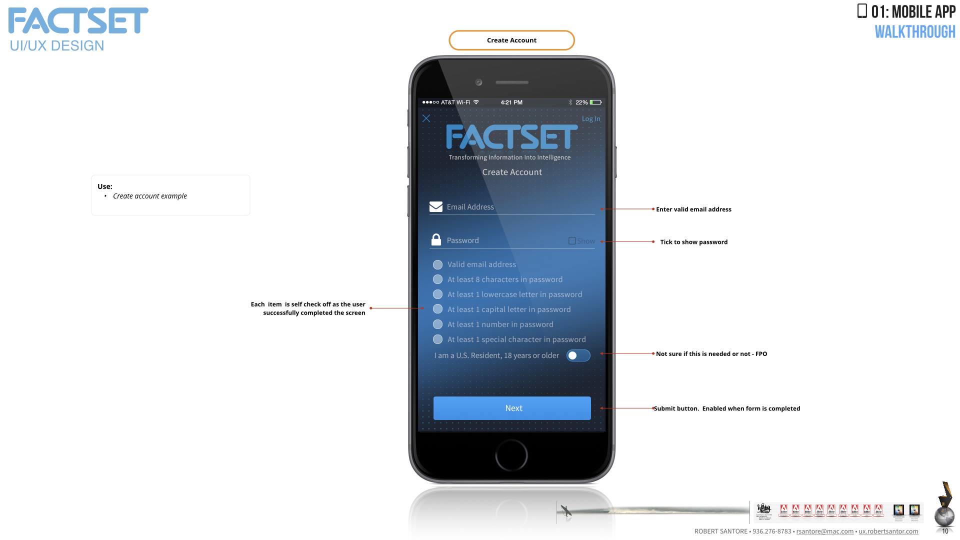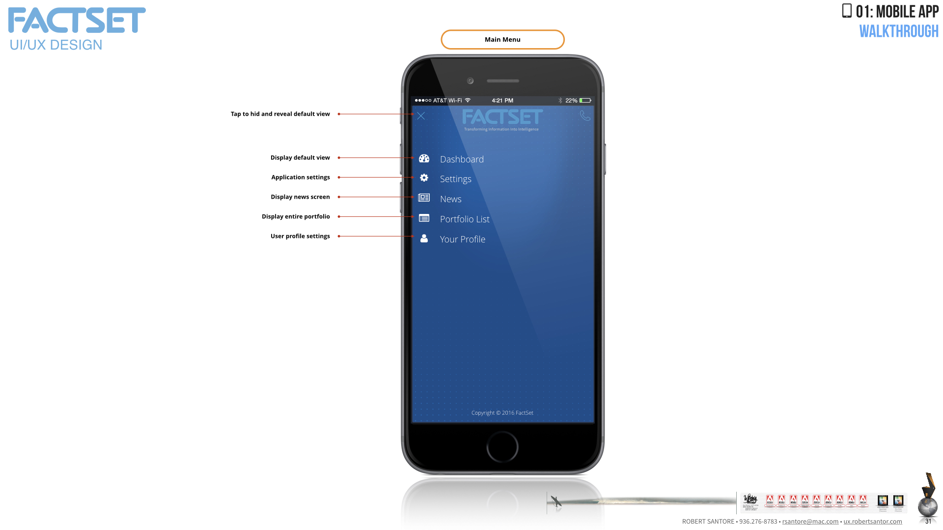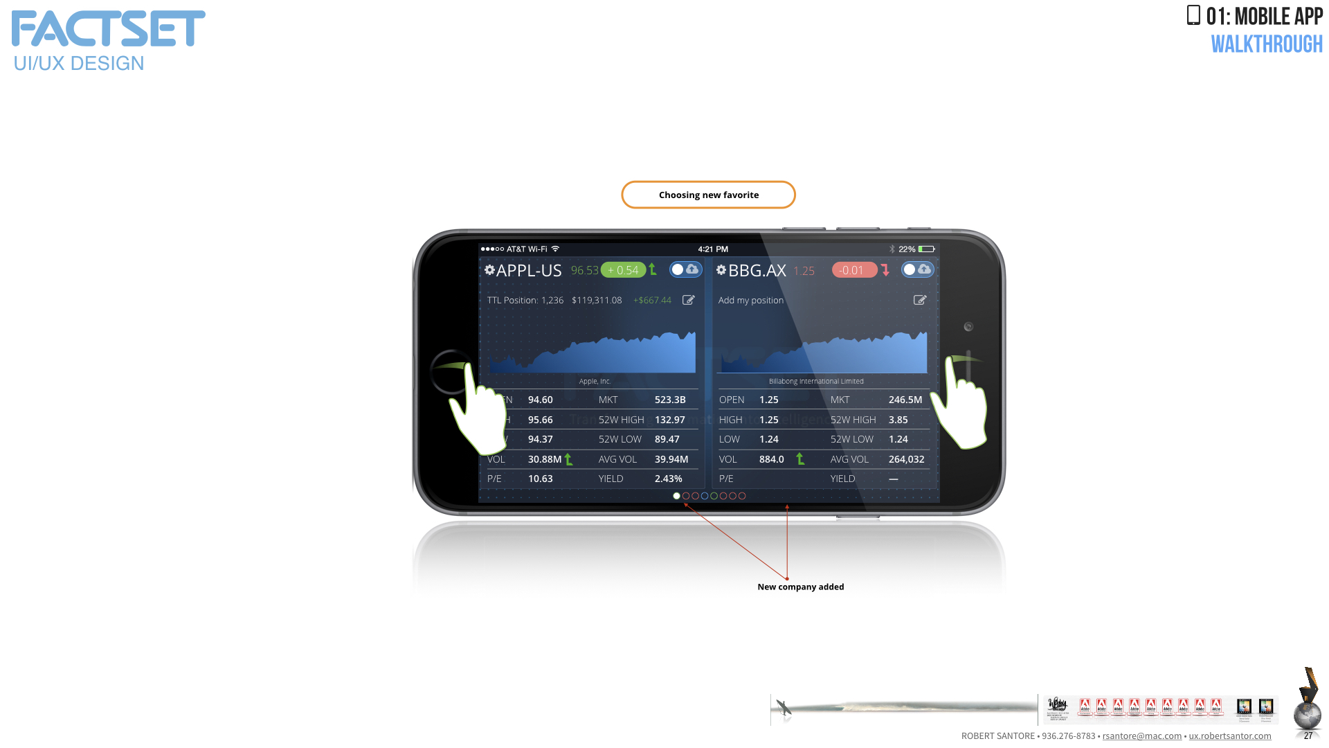 FactSet needed to provide its subscriber’s with access to up to the minute market information, news, and research on the universe of companies, funds, and indices most important to it’s users . I developed a consistent seamless experience across devises and platforms; web, iOS, Android, desktop, tablet and smartphone. Below are examples of the deliverables I created for Factset.